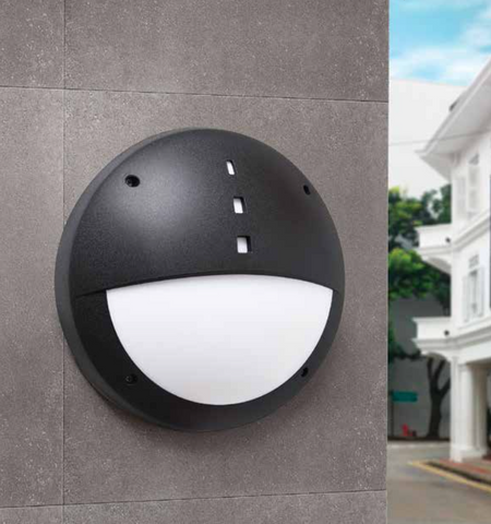 Round bulkhead lamp with ring, eyelid or grid cover. Made of shockproof resin material, UV-rays stabilized, rust and corrosion-free.