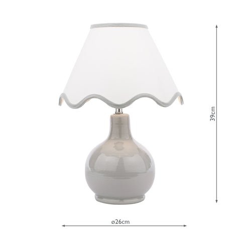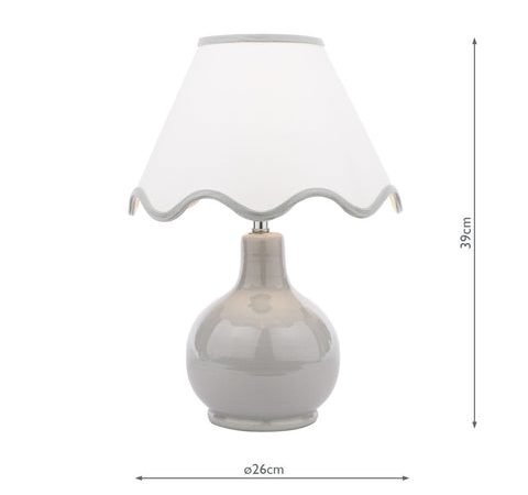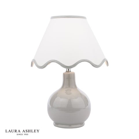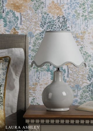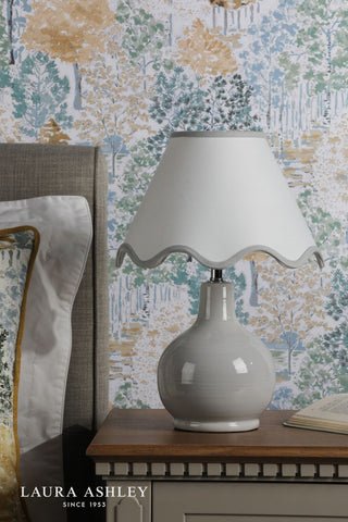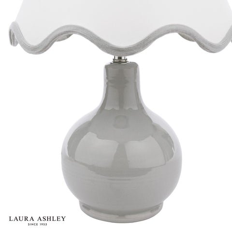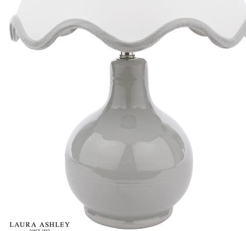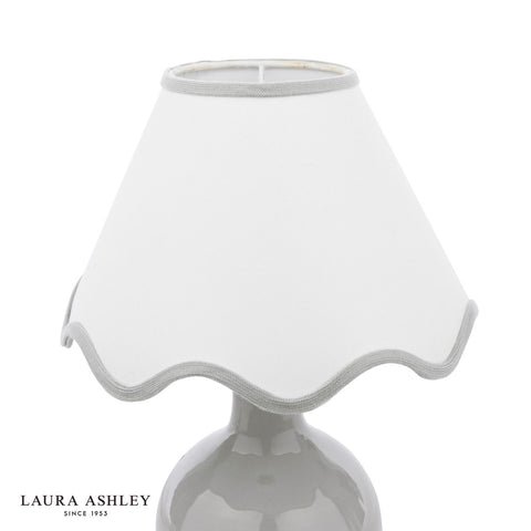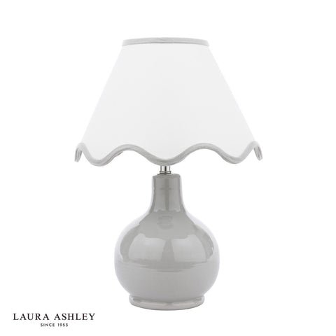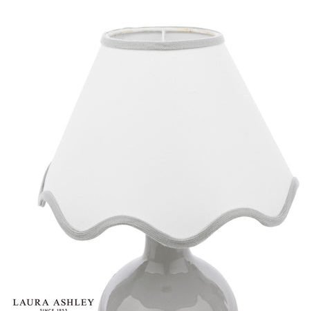 The Laura Ashley Bramhope Table Lamp effortlessly elevates any space, making a perfect addition to any bedside table, desk or sideboard. This gorgeous lamp features a sleek grey ceramic base with a complementing white shade with grey scalloped trim. Perfect for placing on an end table or bedside nightstand, the lamps compact size makes it perfect for smaller areas while still delivering ample lighting. The Bramhope comes complete with a Cream Cotton Mix Tapered drum shade.Bulb not included; takes 1 x 40W max SES CNDLDimmable when paired with suitable bulbs.