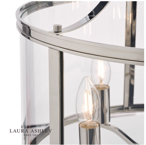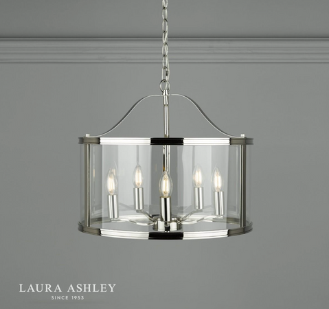 The clean-lined Laura Ashley Harrington ceiling pendant light is a graceful blend of clear glass and sleek metal. A simple, lantern-style drum-shaped case surrounds a suspended quintet of lampholders, all in a vintage polished nickel finish for effortlessly elegant looks.