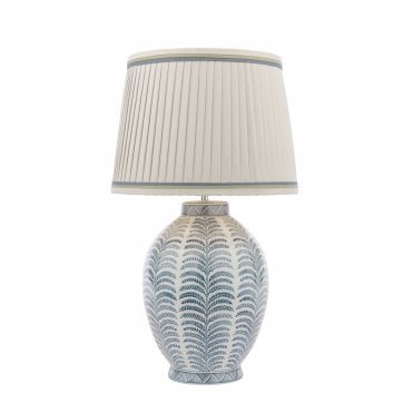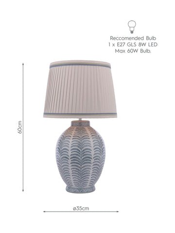 Illuminate your living room or bedroom with the Laura Ashley Stannard Table Lamp. This gorgeous lamp features a large pleated shade with a coloured trim, adding a touch of sophistication to your home. Position it atop an end table or use as a bedside lamp. With its eye-catching print and timeless shape, the Stannard lamp makes a tasteful statement that enhances your decor. The Stannard comes complete with a Natural Faux Silk Tapered drum shade.Bulb not included; takes 1 x 60W max ES GLS