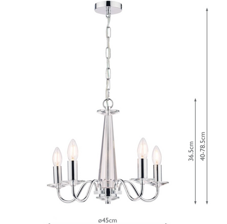 Five polished chrome arms flow from a clear cut crystal thick glass pinnacle of perfection rather like an Egyptian obelisk. With echoes of the 1960s, this elegant light will add contemporary glamour to your home.This ceiling pendant fitting has a matching finish ceiling rose and hanging chain plus a discreet clear cable. Shades not needed. Height is adjustable at the point of installation (40–79cm).
