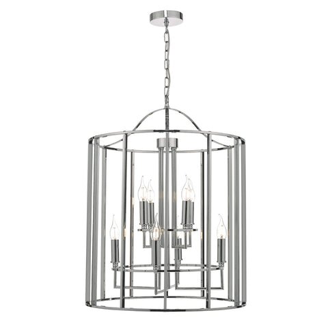 The statement Myka features an angular pyramid of eight lights that are surrounded by an oversized lantern cage. Complete with a curved top and polished chrome finish.