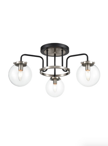 The Atom 3-light ceiling mounted fitting in matt black and satin nickel with clear glass spheres.