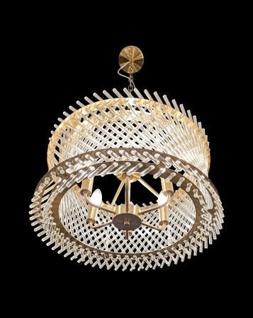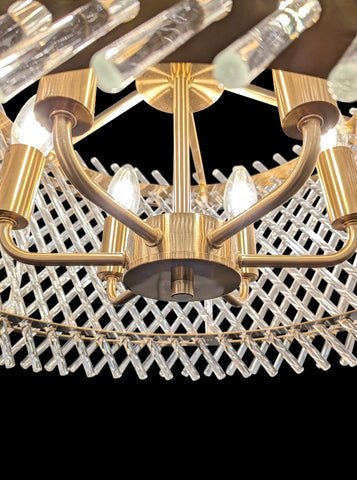 Aged brass finish pendant with angled glass rods which refract the light.