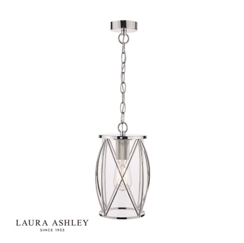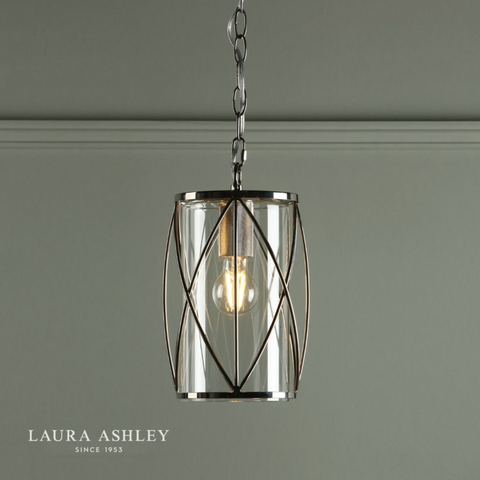 The Laura Ashley Beckworth ceiling light is a large modern pendant in a gorgeous lantern style. A slick, curved lattice in vintage polished nickel encasing a clear glass cylinder gives this hanging ceiling light a contemporary style that enhances any interior theme.