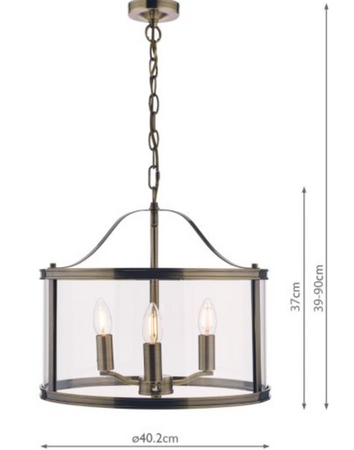 The clean-lined Laura Ashley Harrington ceiling pendant light is a graceful blend of clear glass and sleek metal. A simple, lantern-style drum-shaped case surrounds a suspended trio of lampholders, all in a warm antique brass finish for effortlessly elegant looks. The 3 light Harrington ceiling pendant is a subtle yet stylish piece to illuminate your favourite room and create a bright, inviting space.This ceiling pendant fitting has a matching finish ceiling rose and hanging chain plus a coordinating gold cable. Height is adjustable at the point of installation (39–90cm).——Number of lamps – 3Lamp Type – E14Finish – Antique Brass
