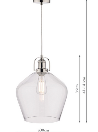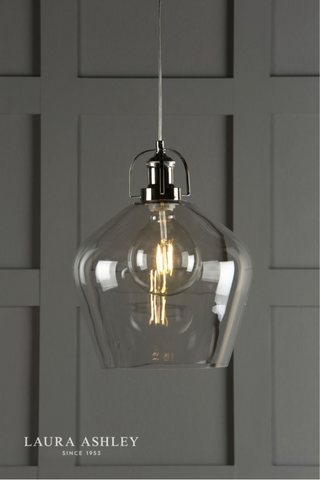 For instant finesse, try the Rye pendant lampshade from Laura Ashley, which features a clear glass goblet with a decorative vintage polished nickel fittings.This ceiling pendant fitting comes with lampholder and ceiling rose plus a discreet clear cable. Height is adjustable at the point of installation.