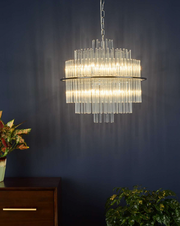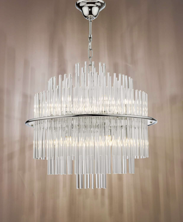 The Lukas 13 light Pendant in polished chrome consists of hundreds of tiered glass rods appearing to give a floating illusion inside a polished chrome band. This fitting is height adjustable and would make the perfect statement piece for any living area.