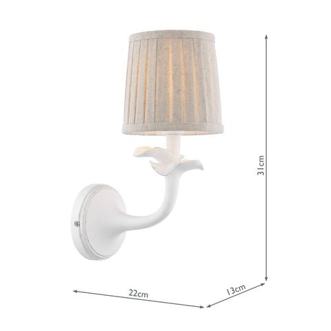 Bring the timeless country charm of Laura Ashley into your home with the Eleni 1 Light Wall Light. Featuring an oatmeal-hued pleated fabric shade adorned with a delicate floral pattern, this elegant light adds a refined touch to any living room or bedroom. Offering a warm, inviting glow, it’s perfect for bedside illumination during night-time reading or for brightening up a cosy living room reading nook. The Eleni comes complete with a Natural Fabric Drum shade.Bulb not included; takes 1 x 25W max SES CNDLDimmable when paired with suitable bulbs.
